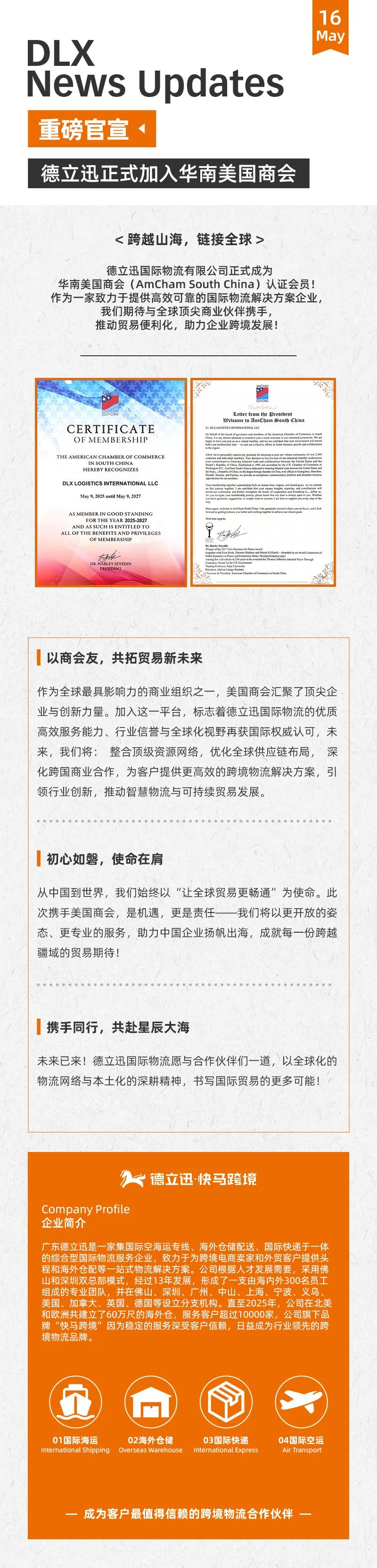 德立迅国际物流有限公司正式成为华南美国商会(AmCham SouthChina)认证会员!作为一家致力于提供高效可靠的国际物流解决方案企业我们期待与全球顶尖商业伙伴携手推动贸易便利化,助力企业跨境发展!